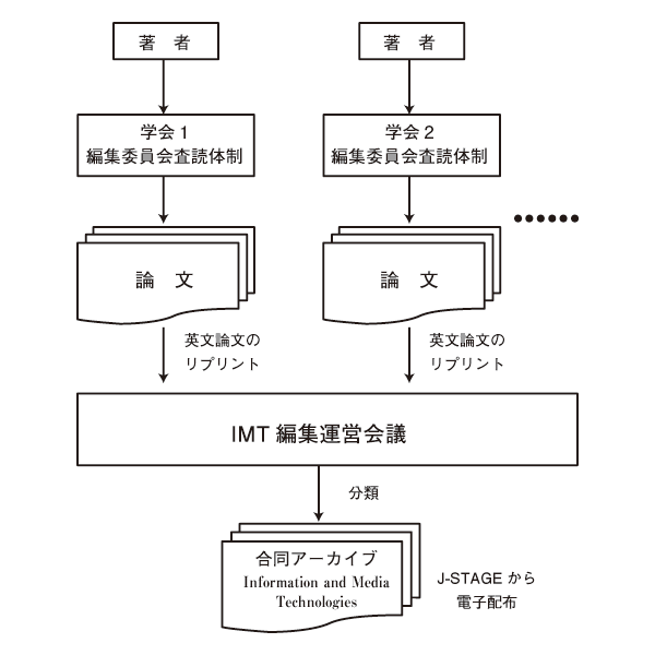 言語処理学会,ヒューマンインタフェース学会,情報処理学会,映像情報メディア学会,人工知能学会,日本ソフトウェア科学会,日本データベース学会は,情報科学技術情報を世界に向けて合同で発信するために編集運営会議(「Information and Media Technologies編集運営会議」,以下,「IMT編集運営会議))を設立し,IMT編集運営会議に参加する学会(以下,「IMT会員学会※」)が刊行した英文論文のリプリント(以下,「記事」)を束ねて,2006年6月15日から合同アーカイブ(「Information and Media Technologies」,以下「IMT」)を公開しています.