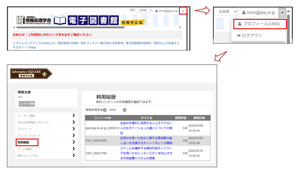 この「利用明細」画面上でご不明な点等などございましたら、ipsj-ixsq@nii.ac.jp(@は半角にしてください)までご連絡ください。