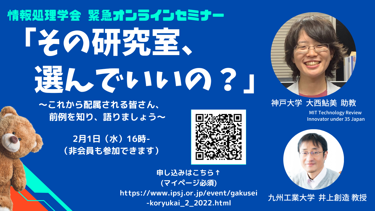第2弾、学生向け緊急セミナーを開催いたします。 今回のテーマは「その研究室、選んでいいの?」です。 悩める学生の皆さんのご参加をお待ちしております。