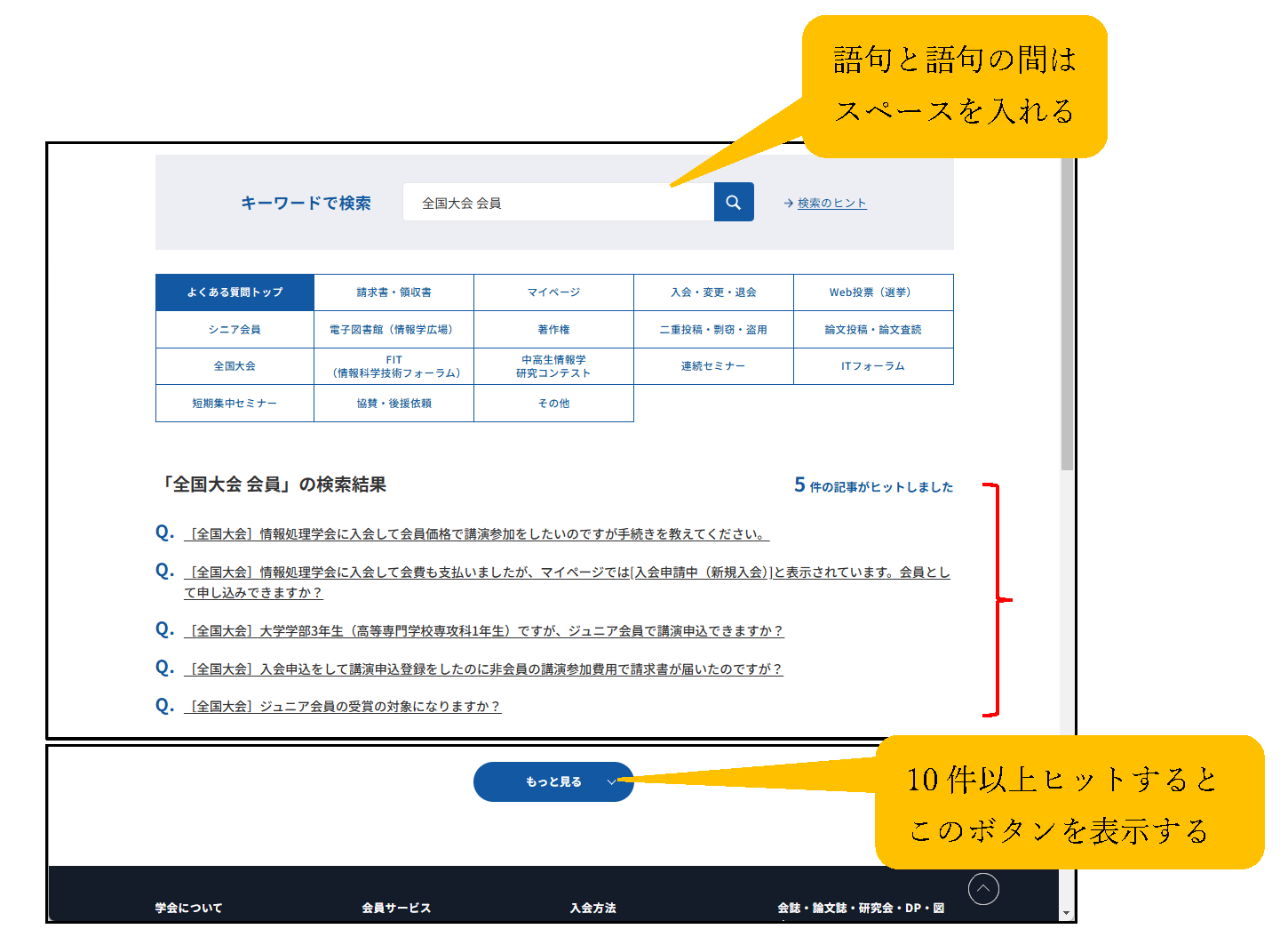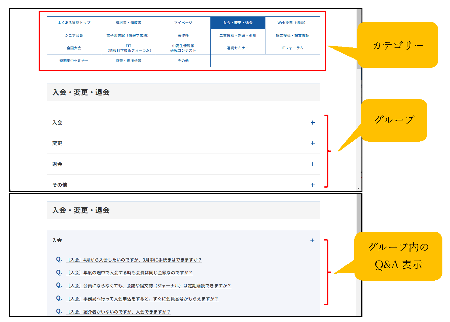 (例)全国大会 会員 - または、上部カテゴリーを選択すると関連する質問が表示されます。グループ化されている場合はグループ名をクリックするとQ&Aが表示されます。