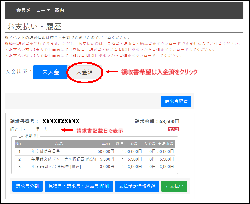 ※ただし、分割できないものもあります。入金状態:[入金済](押すと画面が切り替わります) 領収書を印刷する